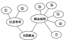 【注】文本框中填入的内容是:①献血前,不吃油腻食物、不饮酒;②献血后,个人活动要适度;③领取登记表;④量血压;⑤检验血型;⑥采血,休息5分钟;⑦交表并登记,领取献血证及纪念品。